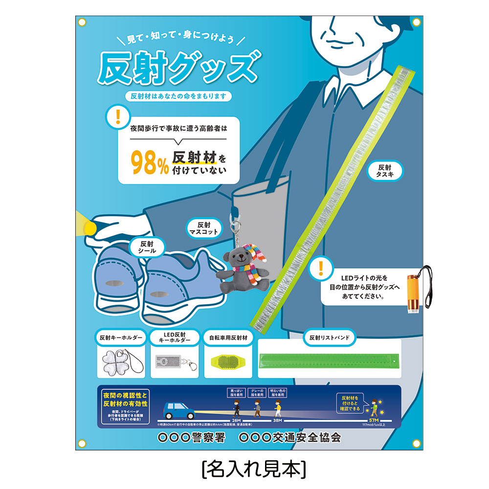 付属品(展示セット内容):EDライト・自転車反射材・反射キーホルダー・反射シール2種・反射マスコット・反射タスキ・反射リストバンド