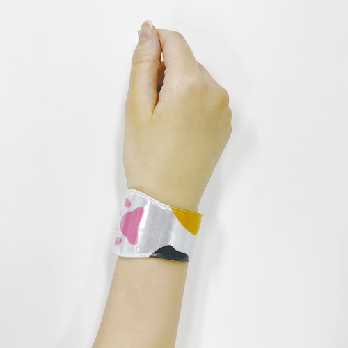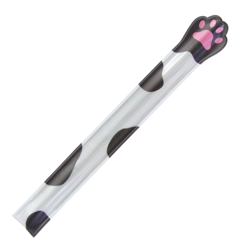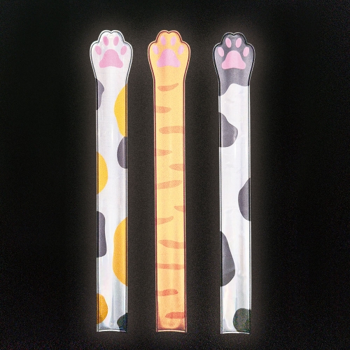 暗いところでライトが当たると反射して光ります 腕やバッグに“パチッ”と巻くだけの簡単装着 肉球が見えるように巻くのがポイント! 大人から子どもまで使いやすい!ネコ好きの人にもおすすめです 裏面は肌触りの良い起毛素材 ※3柄アソート販売です(1本の価格)