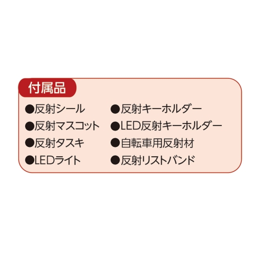 付属品(共通):ライト取付用フック、マジックテープ 付属品(展示セット内容):反射シール・反射マスコット・反射タスキ・LEDライト・反射キーホルダー・LED反射キーホルダー・自転車反射材・反射リストバンド ※付属する商品は、掲載しているものから変更になる場合があります。