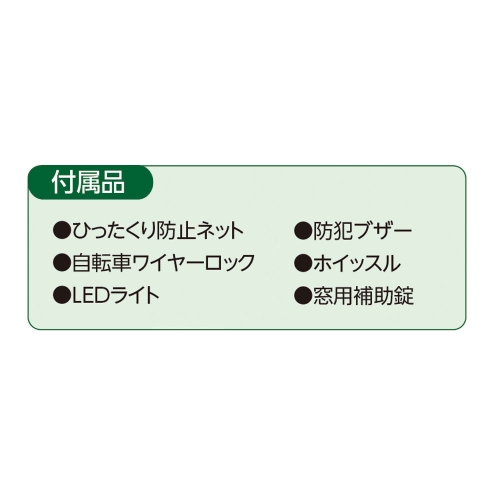 付属品(共通):ライト取付用フック、マジックテープ 付属品(展示セット内容):ひったくり防止ネット・自転車ワイヤーロック・LEDライト・防犯ブザー・ホイッスル・窓用補助錠 ※付属する商品は、掲載しているものから変更になる場合があります。