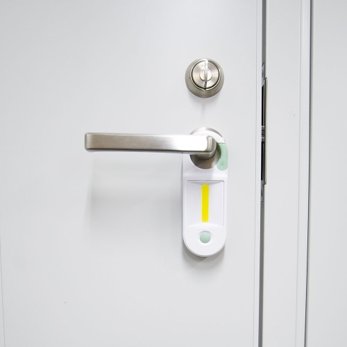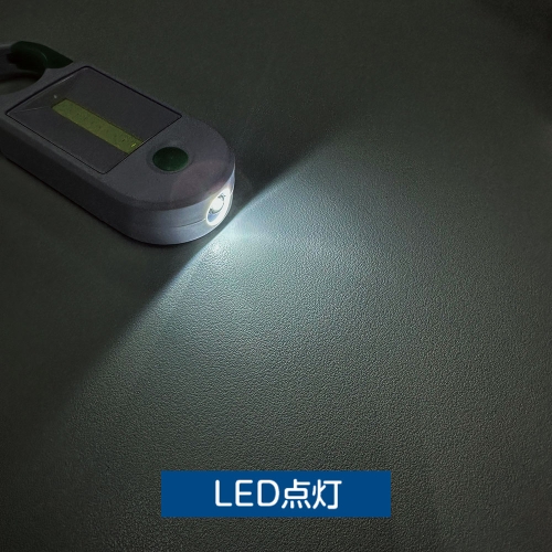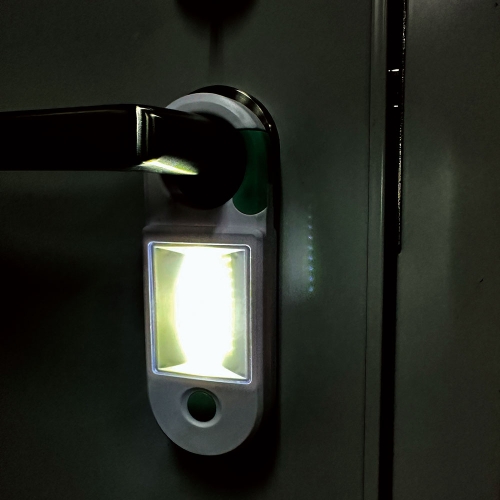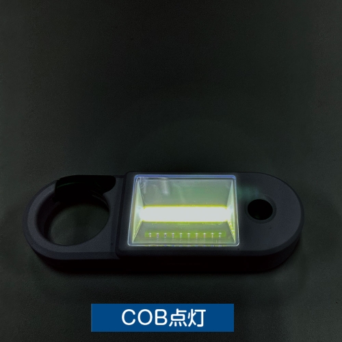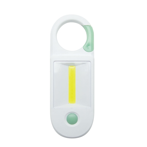 大きなカラビナ付きでドアノブなどに引っかけられます スイッチを押す毎にLED点灯→COB点灯→消灯と切り替わります ピンポイントで明るいLEDライトと、広範囲に明るいCOBライトの2WAYはとても便利! カラビナ部分とボタンが蓄光素材なので 停電や災害時など、ライトを探す時に役立ちます